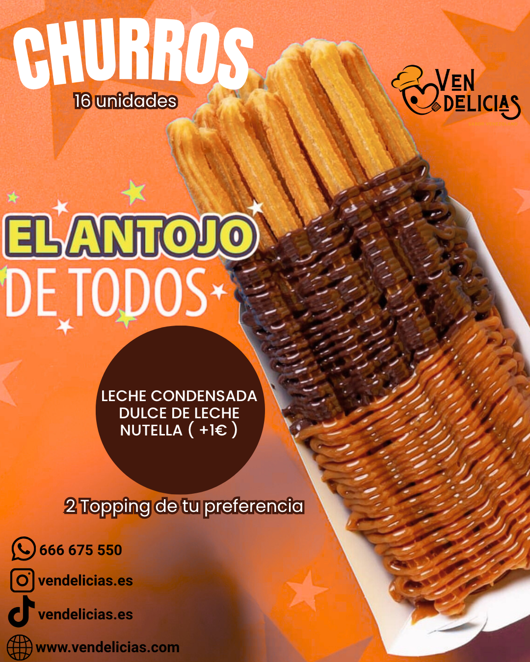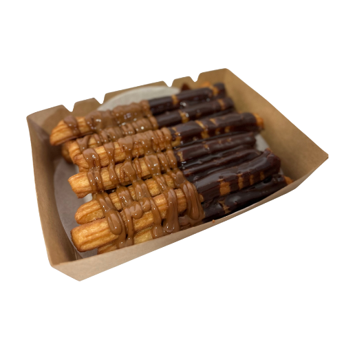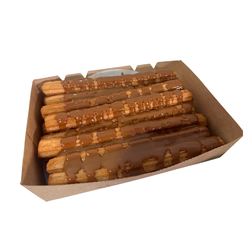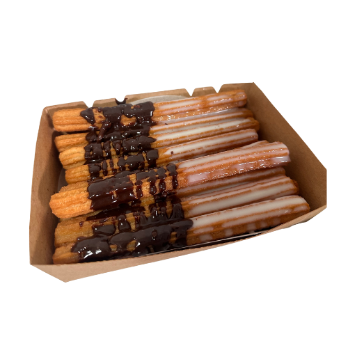 16 raciones de churros con 2 topping a elegir: Leche Condensada, Dulce de Leche o Chocolate.